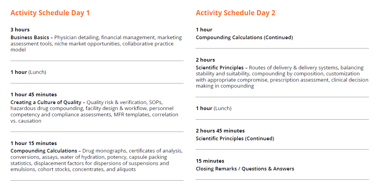 This two-day live virtual event provides foundational training on non-sterile compounding - everything from business basics, to scientific principles such as dosage form stability and suitability, to performing pharmaceutical calculations, to implementing regulatory guidelines, standards of practice, SOPs, and much more.